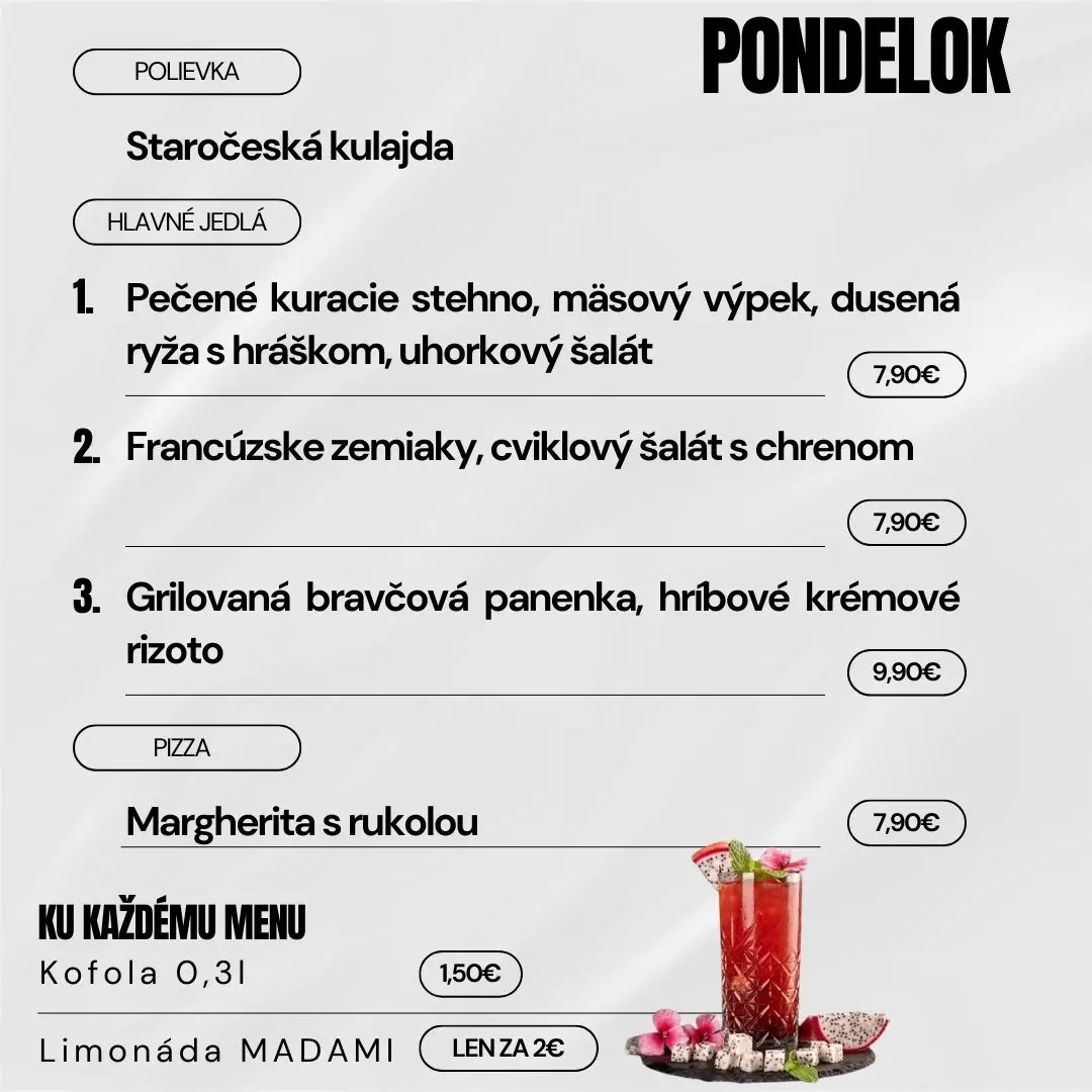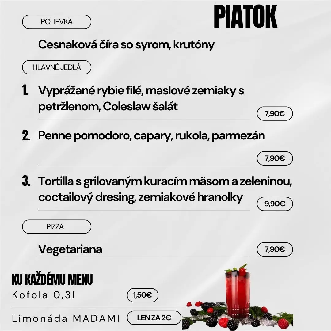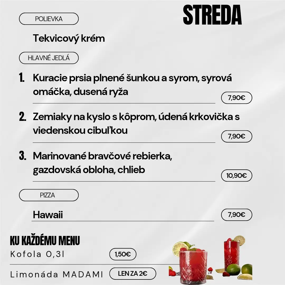 Od pondelka do piatku medzi 11:00 a 14:00 pre vás každý deň pripravujeme čerstvé a pestré denné menu.