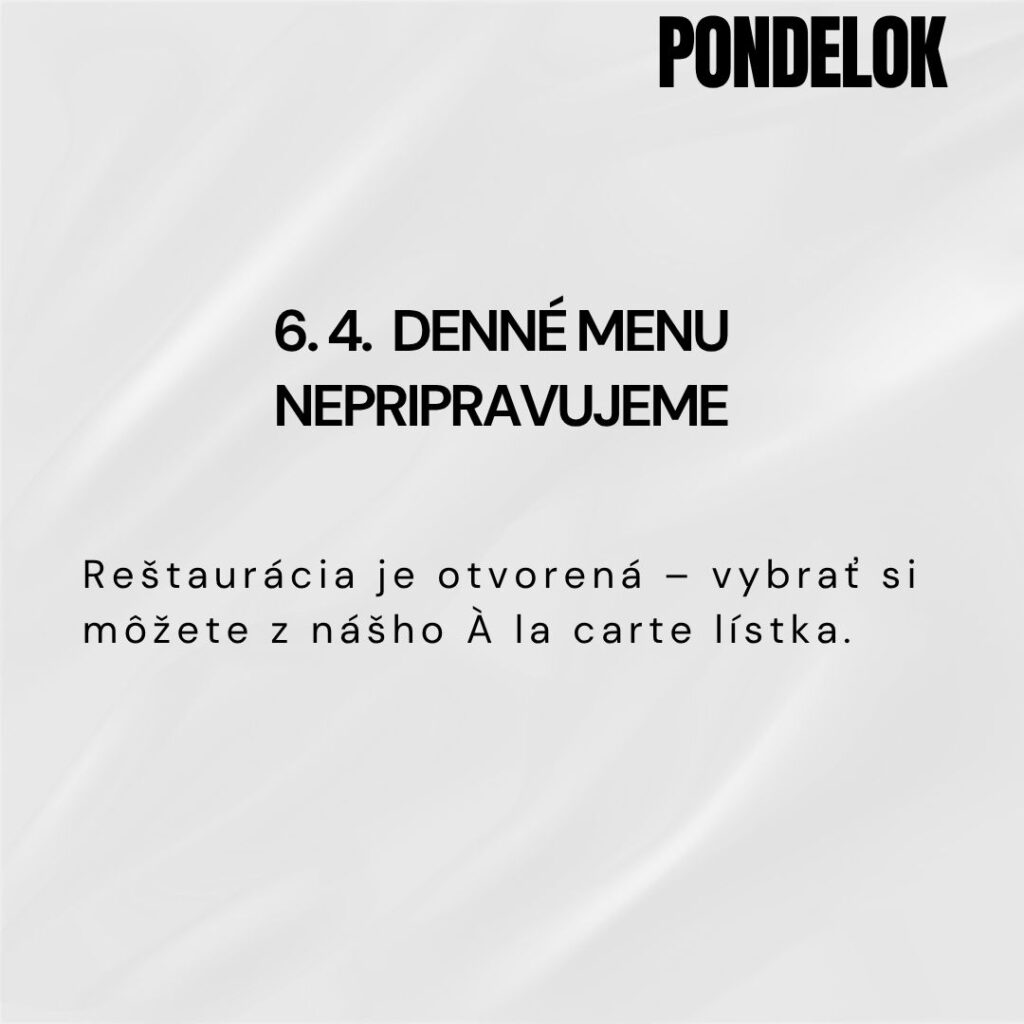 Od pondelka do piatku medzi 11:00 a 14:00 pre vás každý deň pripravujeme čerstvé a pestré denné menu.