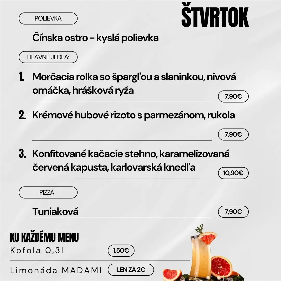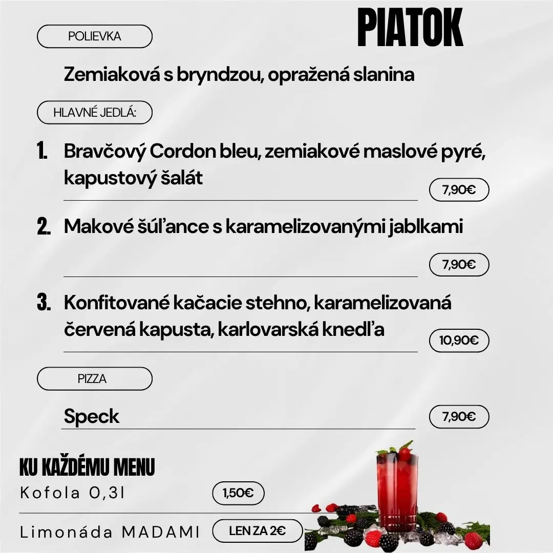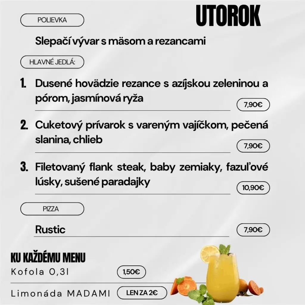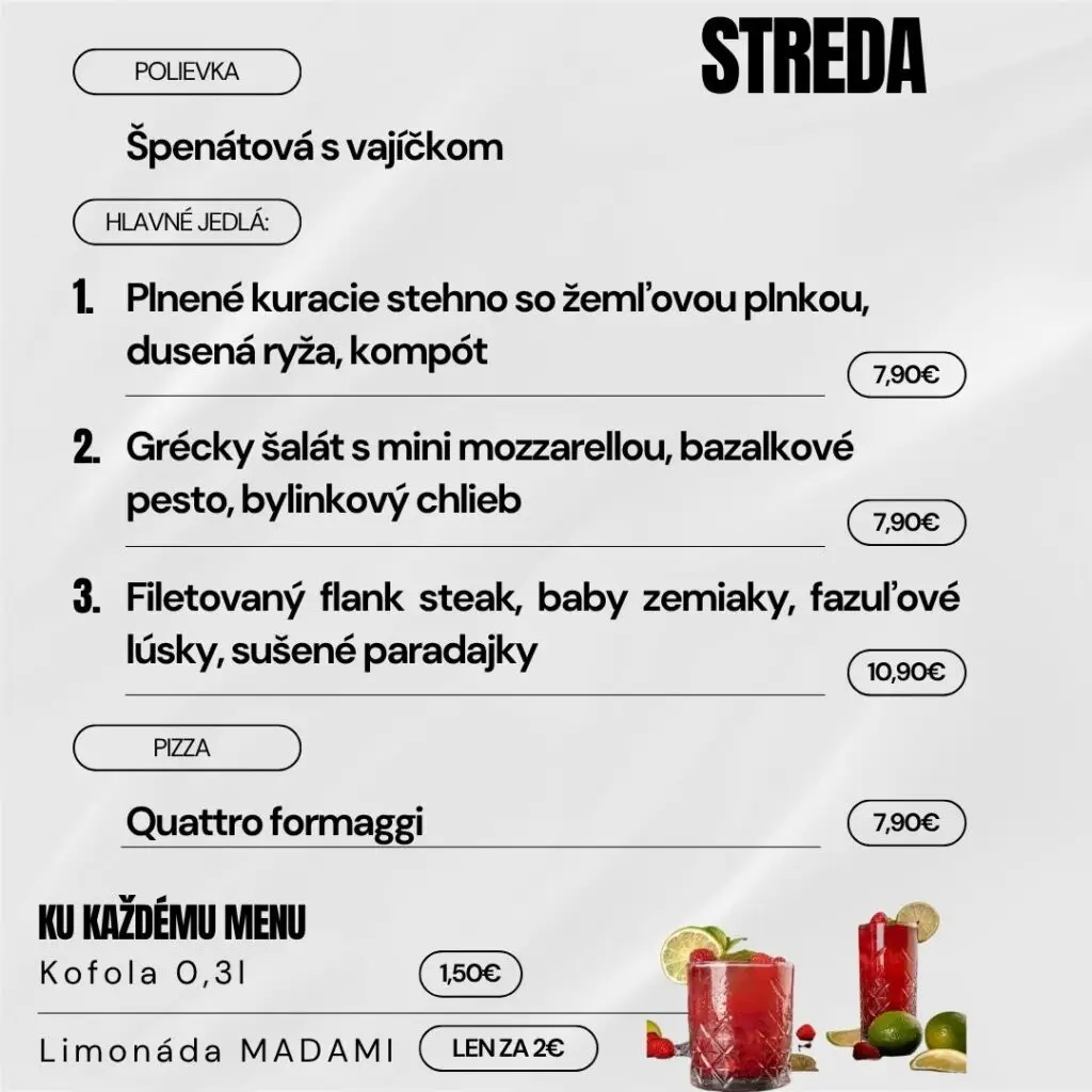 Navyše sme pre Vás cenovo zvýhodnili nápoje k dennému menu, konkrétne kofolu 0,3l za 1,50 € alebo limonádu MADAMI za 2,00 € .