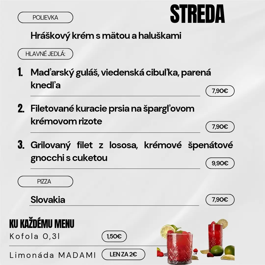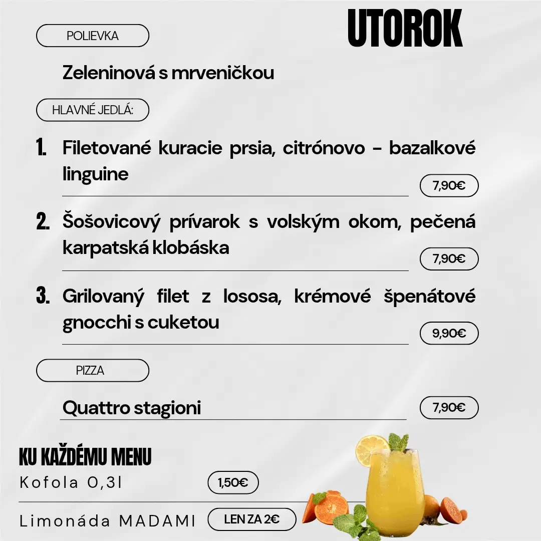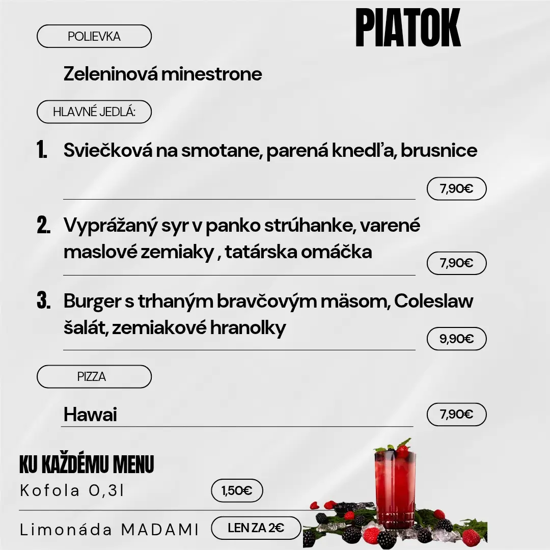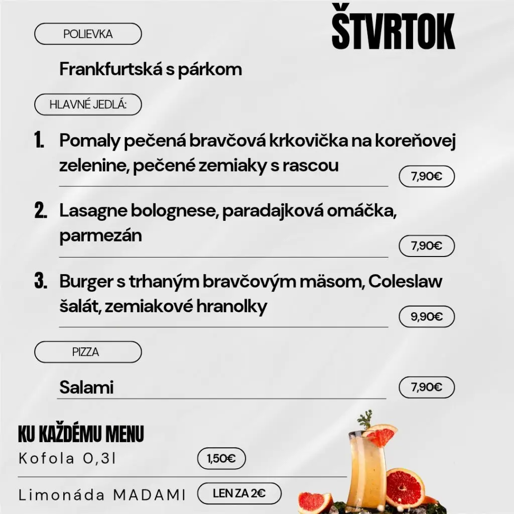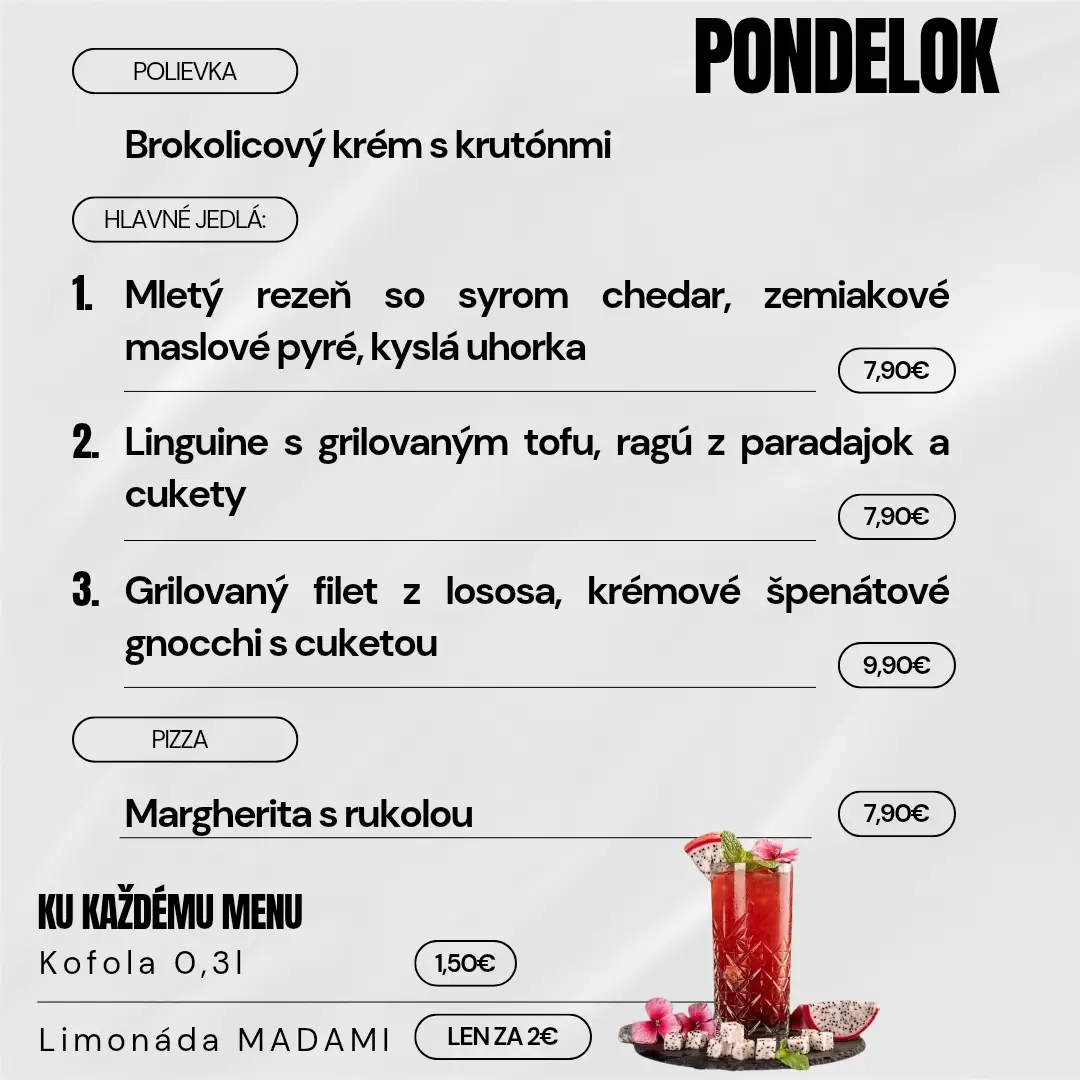 Navyše sme pre Vás cenovo zvýhodnili nápoje k dennému menu, konkrétne kofolu 0,3l za 1,50 € alebo limonádu MADAMI za 2,00 € .